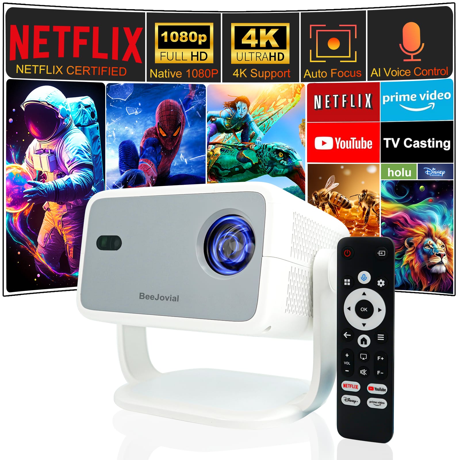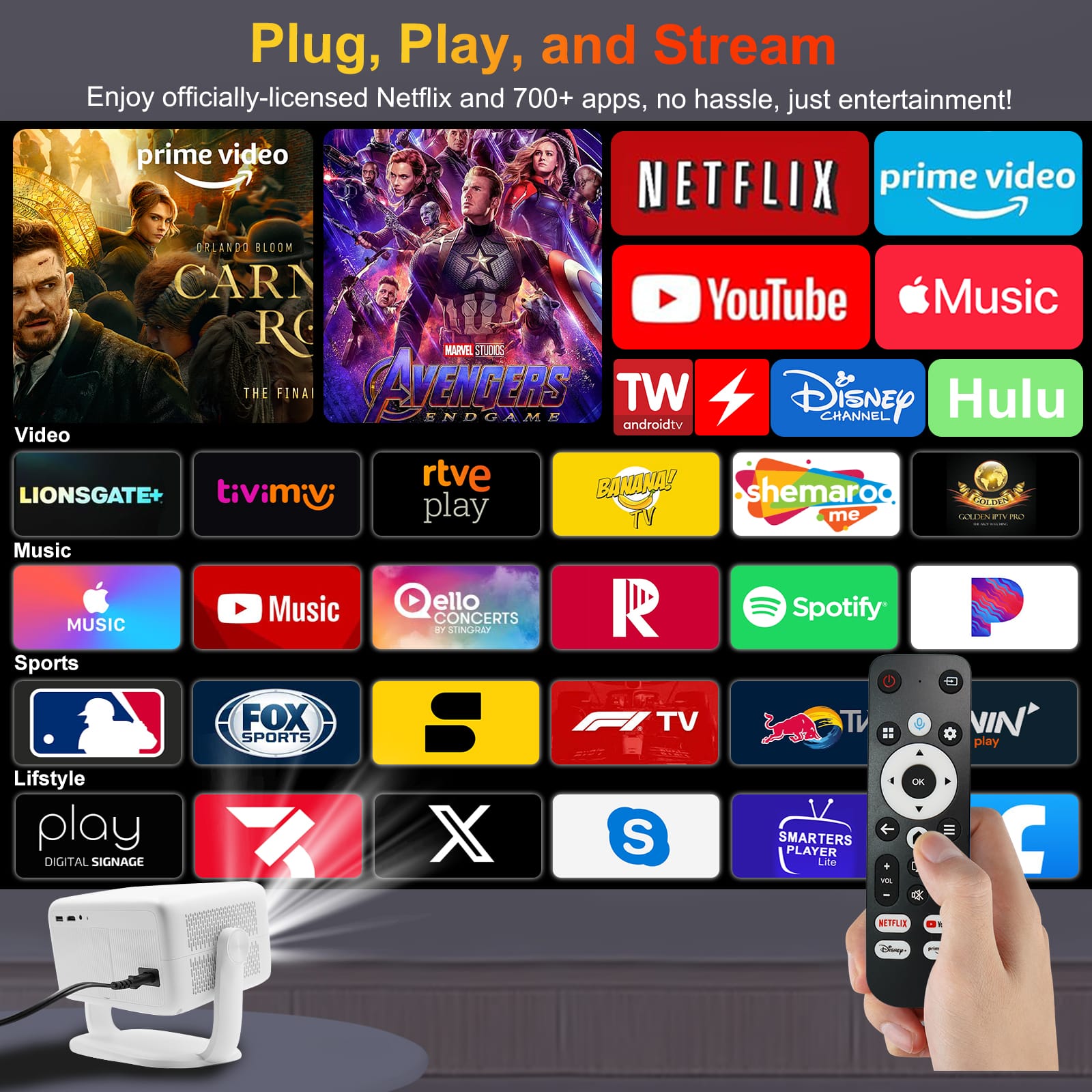 - PLUG IN AND PLAY – No TV Stick needed. Powered by Android 13 and Google CTS-approved, the smart mini projector offers seamless access to officially licensed Netflix and 700+ other streaming TV apps like Youtube, Prime Video, Disney+, ESPN, and Hulu, with stable performance and no app restrictions. Enjoy endless entertainment in movies, game, music, news, sports, and more