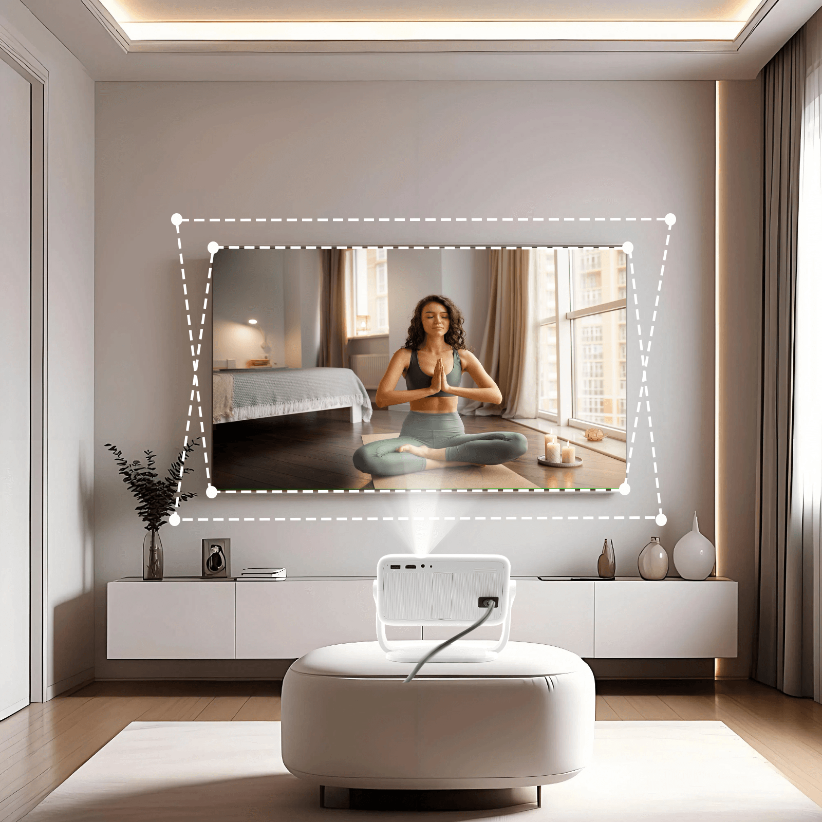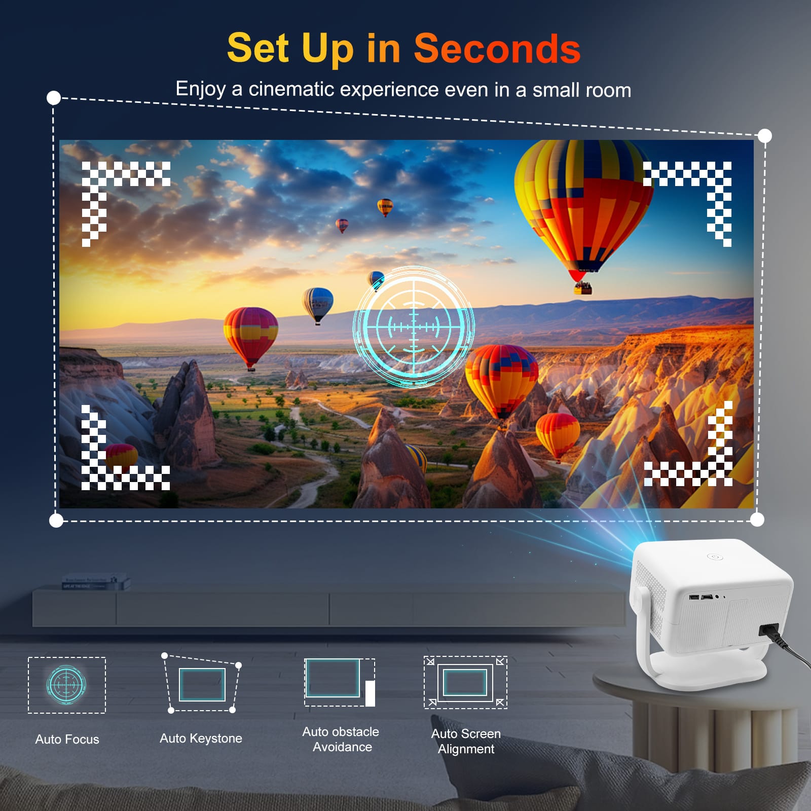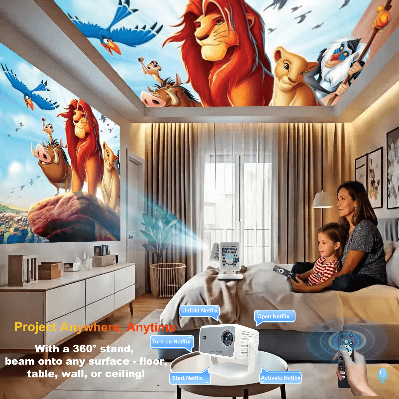 - EASY TO SET UP – The portable projector auto-adjusts focus, keystone correction, obstacle avoidance and screen fit in 3 seconds. Its 360° freestyle stand lets you beam onto any surface—floor, table, wall, or ceiling. With 50% zoom and AI voice control, it’s a user friendly projector for any occasion: bedroom, backyard, kitchen, living room, classroom, or small business meeting
