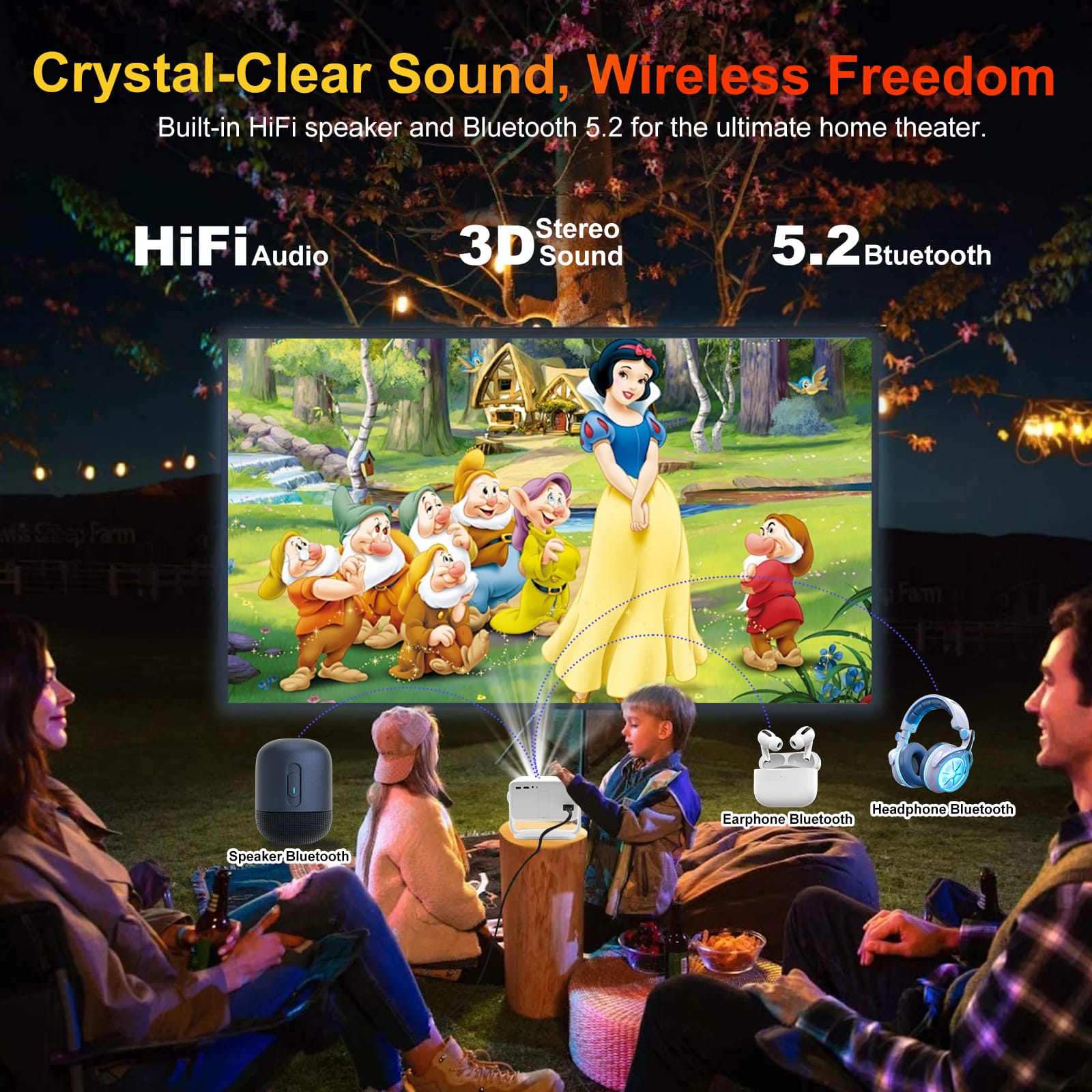 - BUILT-IN SOUND, BLUETOOTH 5.2 -The small projector’s fully sealed optical system keeps out dust, ensuring top performance and a longer lifespan.. Enjoy rich sound through the built-in 3W HiFi stereo speaker or easily connect to your Bluetooth headset, speakers, or AirPods wirelessly via Bluetooth 5.2, bringing you better home theater or gaming experience