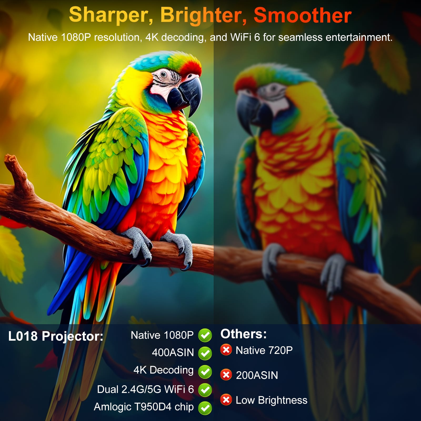 - NATIVE 1080P, 4K SUPPORTED – Equipped with Amlogic T950D4 chip, 400 ANSI brightness, and native 1920x1080p resolution with 4K decoding support, the native 1080P Projector delivers ultra vivid image, super high contrast, and sharp details. With a robust 2.4G/5G dual-band WiFi 6, it ensures smooth, instant wireless screen mirroring (Airplay/Miracast) of videos or pictures from your ios or android phones